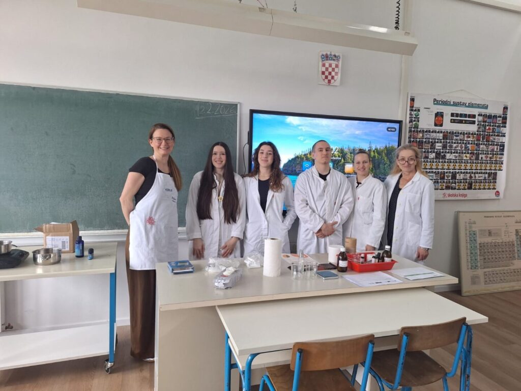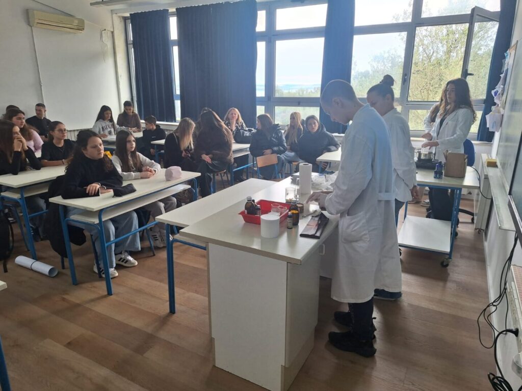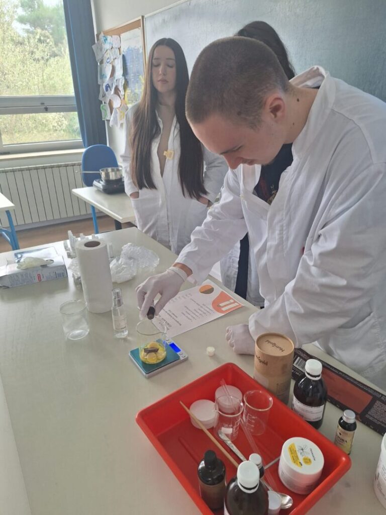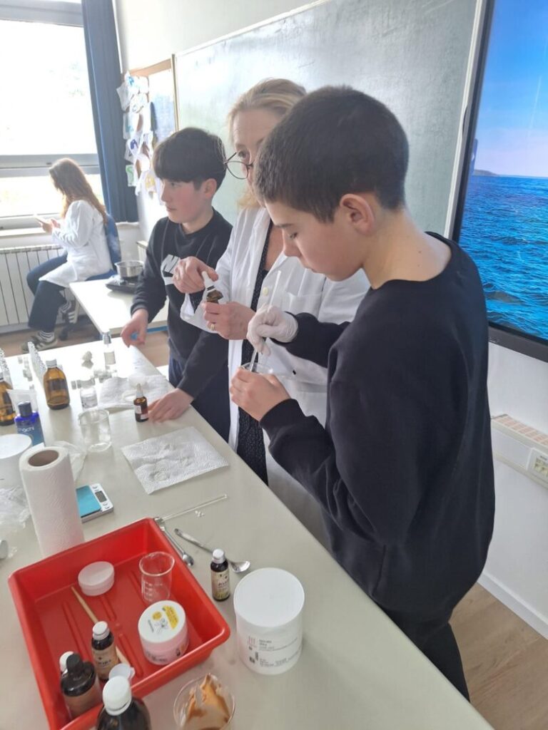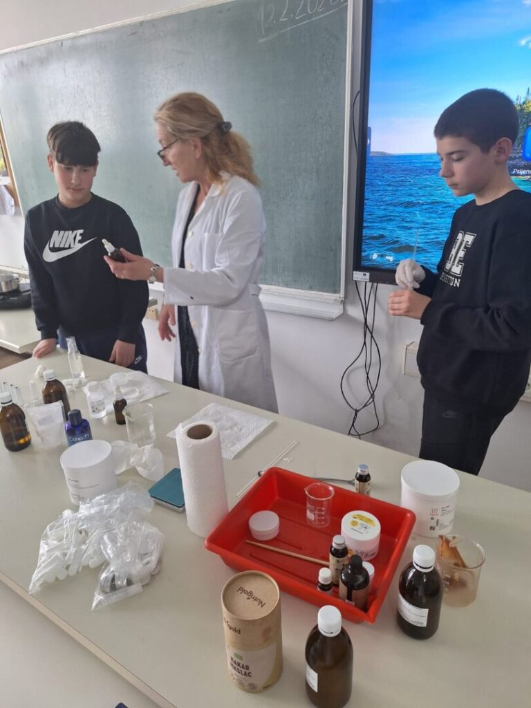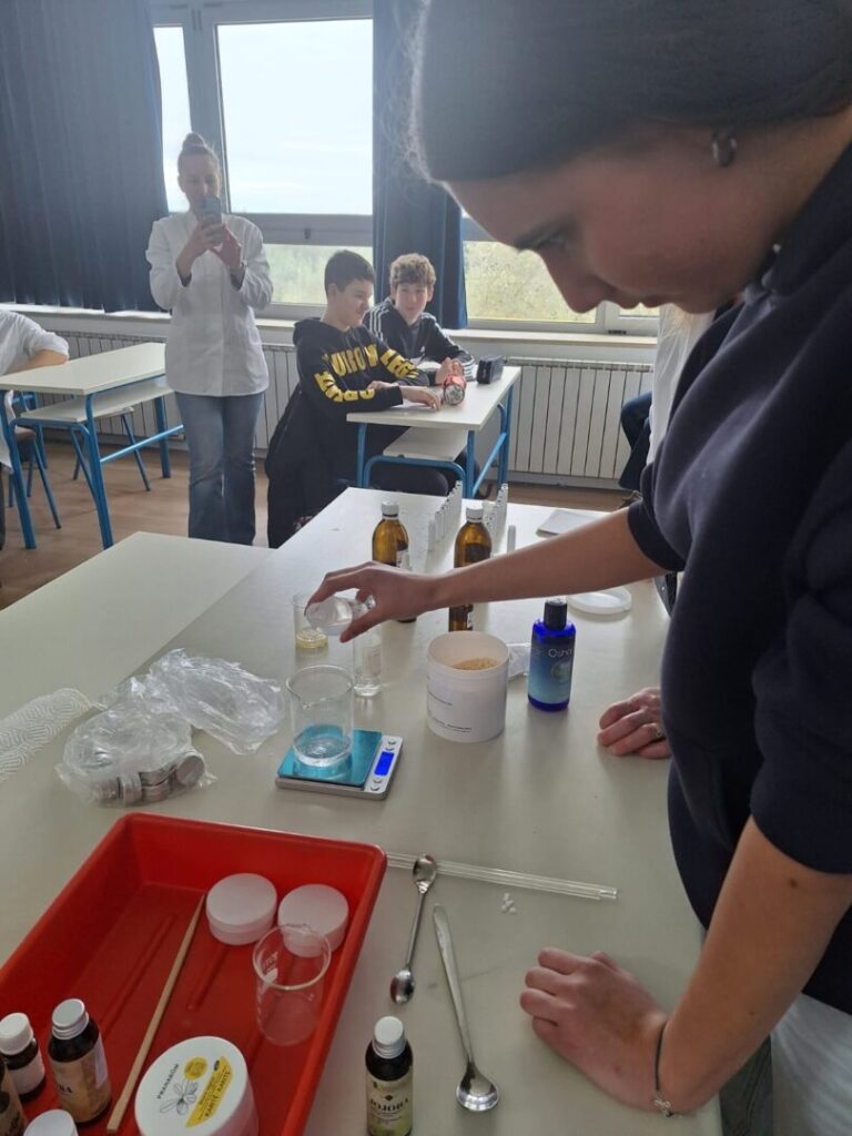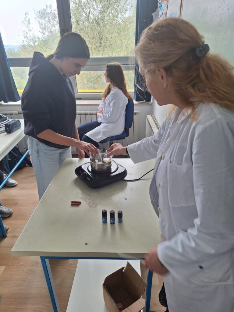 Radionica je započela kratkim teorijskim uvodom o prirodnim sastojcima koji se koriste u izradi kozmetike – pčelinjem vosku, kakao maslacu, biljnim uljima i eteričnom ulju naranče. Učenici su saznali koja je uloga pojedinog sastojka u njezi usana te zašto je važno birati prirodne, kvalitetne i ekološki prihvatljive sirovine.