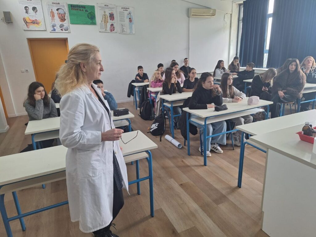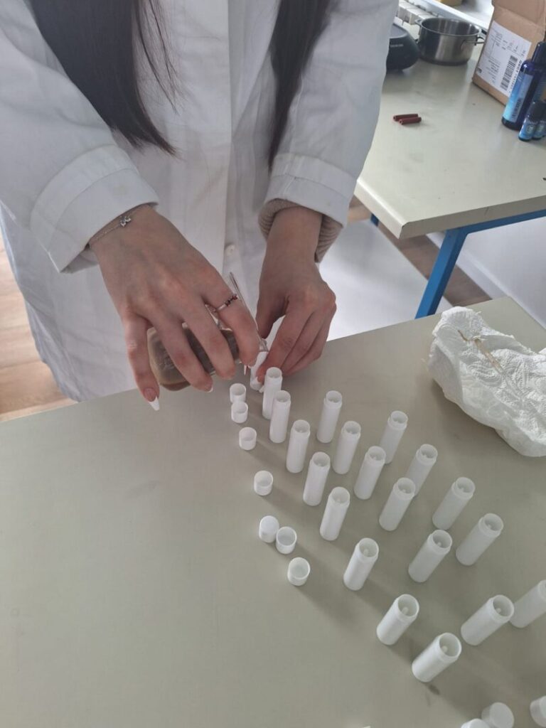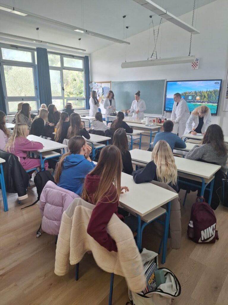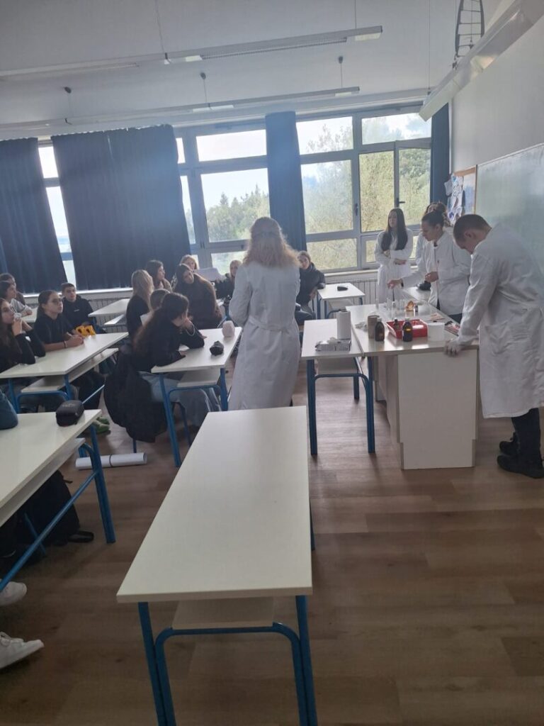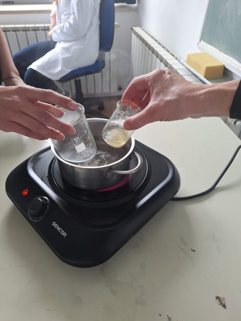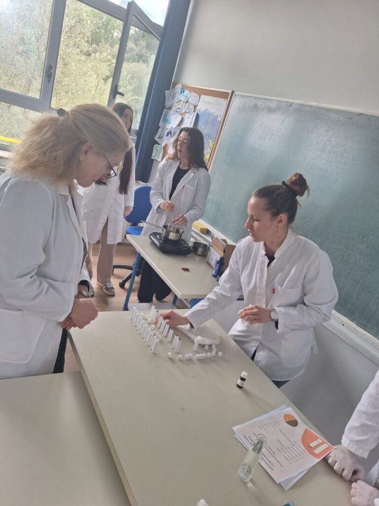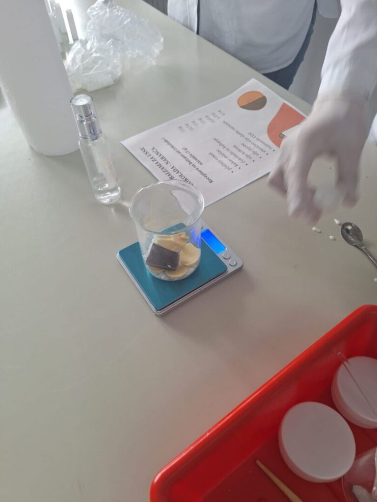 Radionica je započela kratkim teorijskim uvodom o prirodnim sastojcima koji se koriste u izradi kozmetike – pčelinjem vosku, kakao maslacu, biljnim uljima i eteričnom ulju naranče. Učenici su saznali koja je uloga pojedinog sastojka u njezi usana te zašto je važno birati prirodne, kvalitetne i ekološki prihvatljive sirovine.