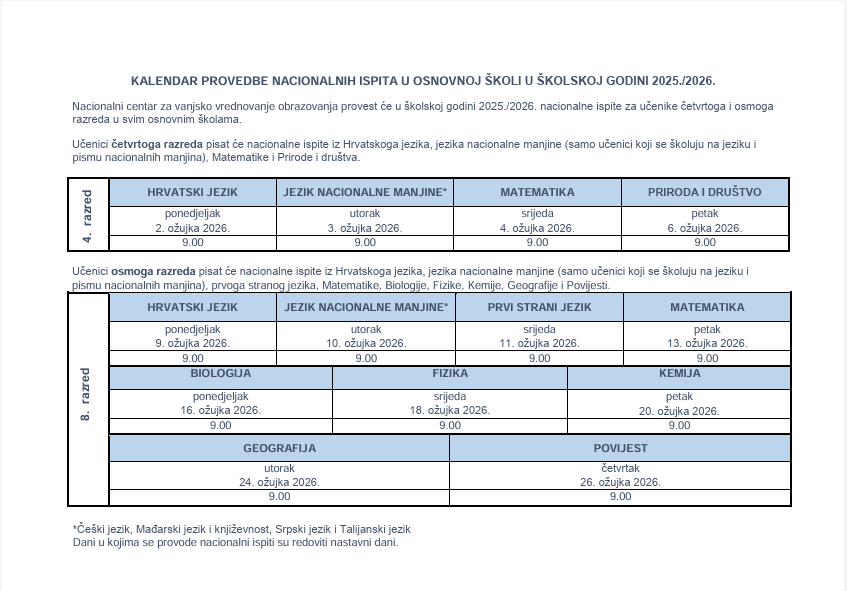 Nacionalni ispiti započinju 9. ožujka 2026. (ponedjeljak) u 9:00 sati ispitom iz Hrvatskoga jezika.