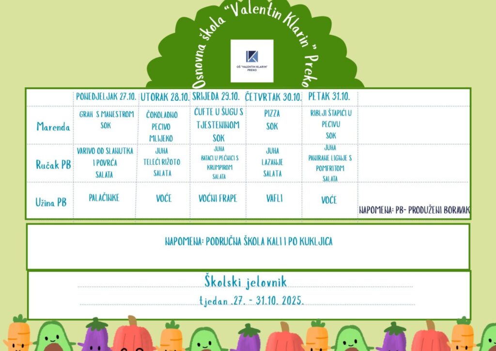 Školski jelovnik, 27. – 31.10. 2025. godine